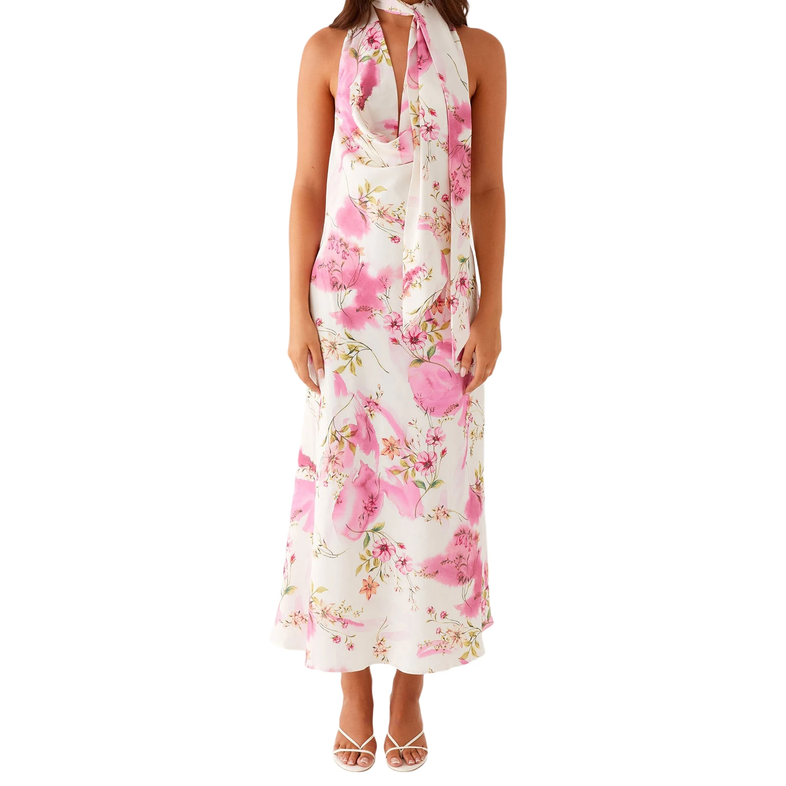 Women Summer Sleeveless Dress Floral Print Cowl Neck Backless Halter Neck Dress and Scarf for Beach Club Streetwear