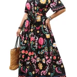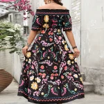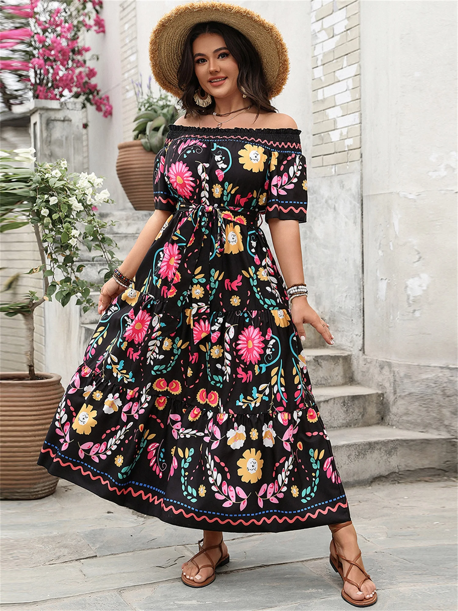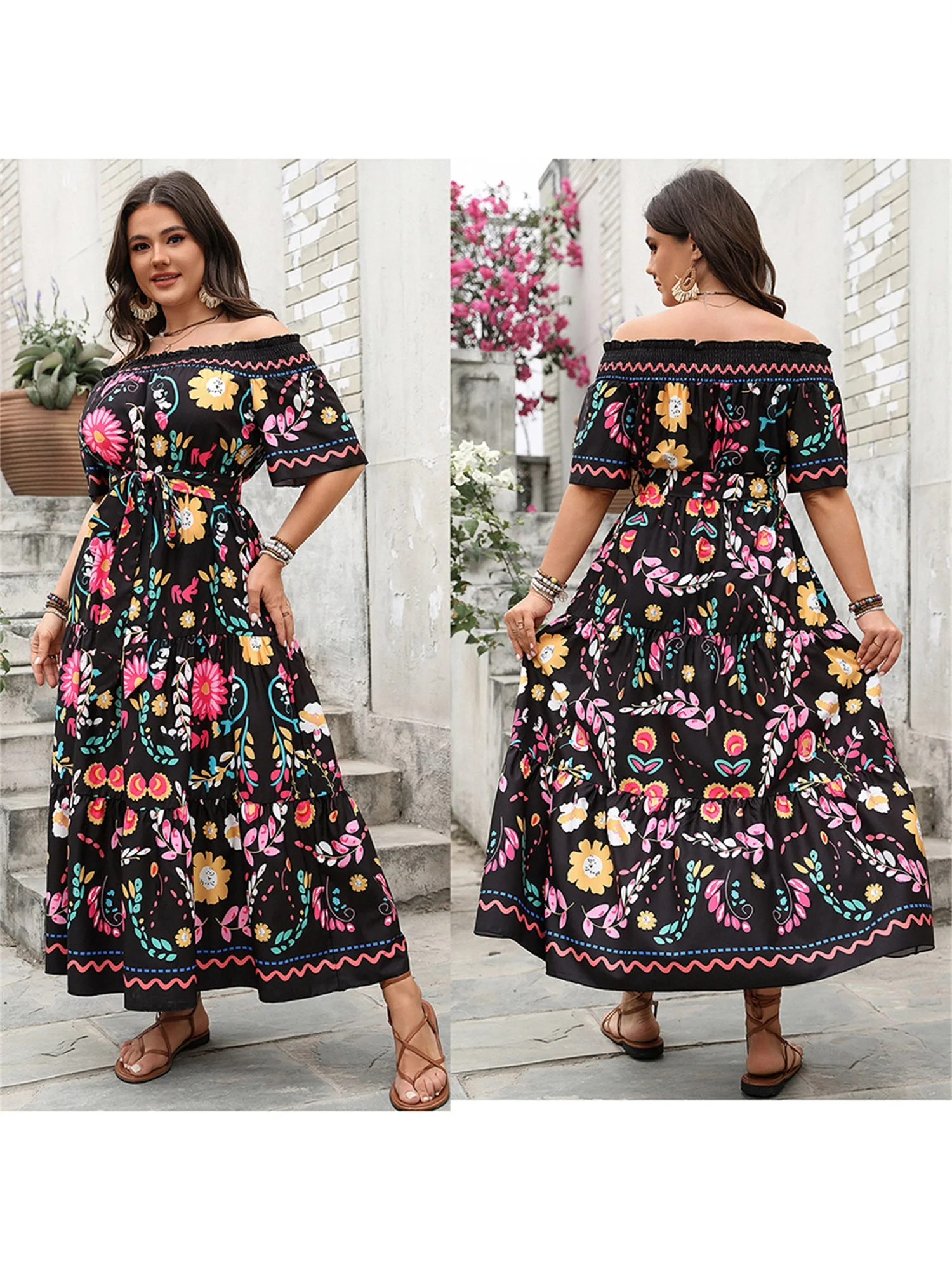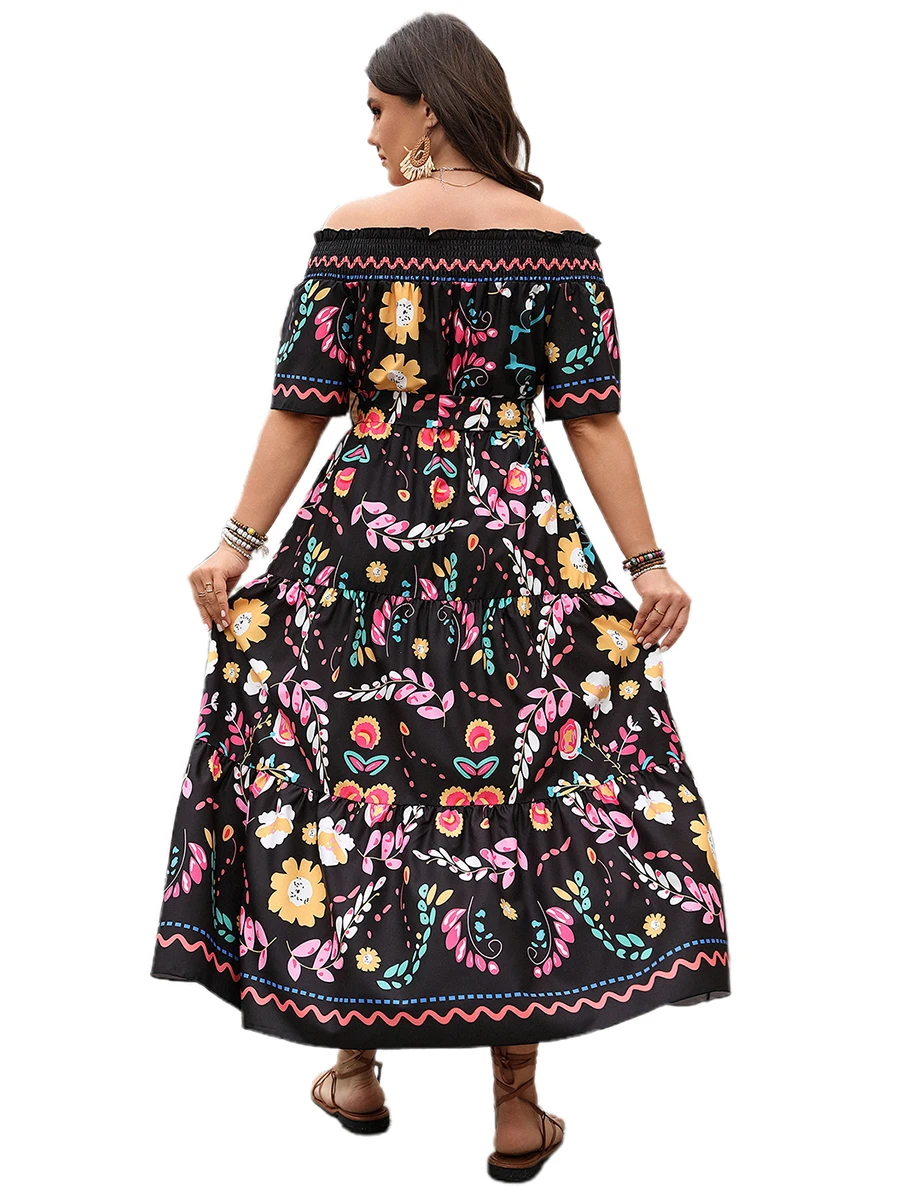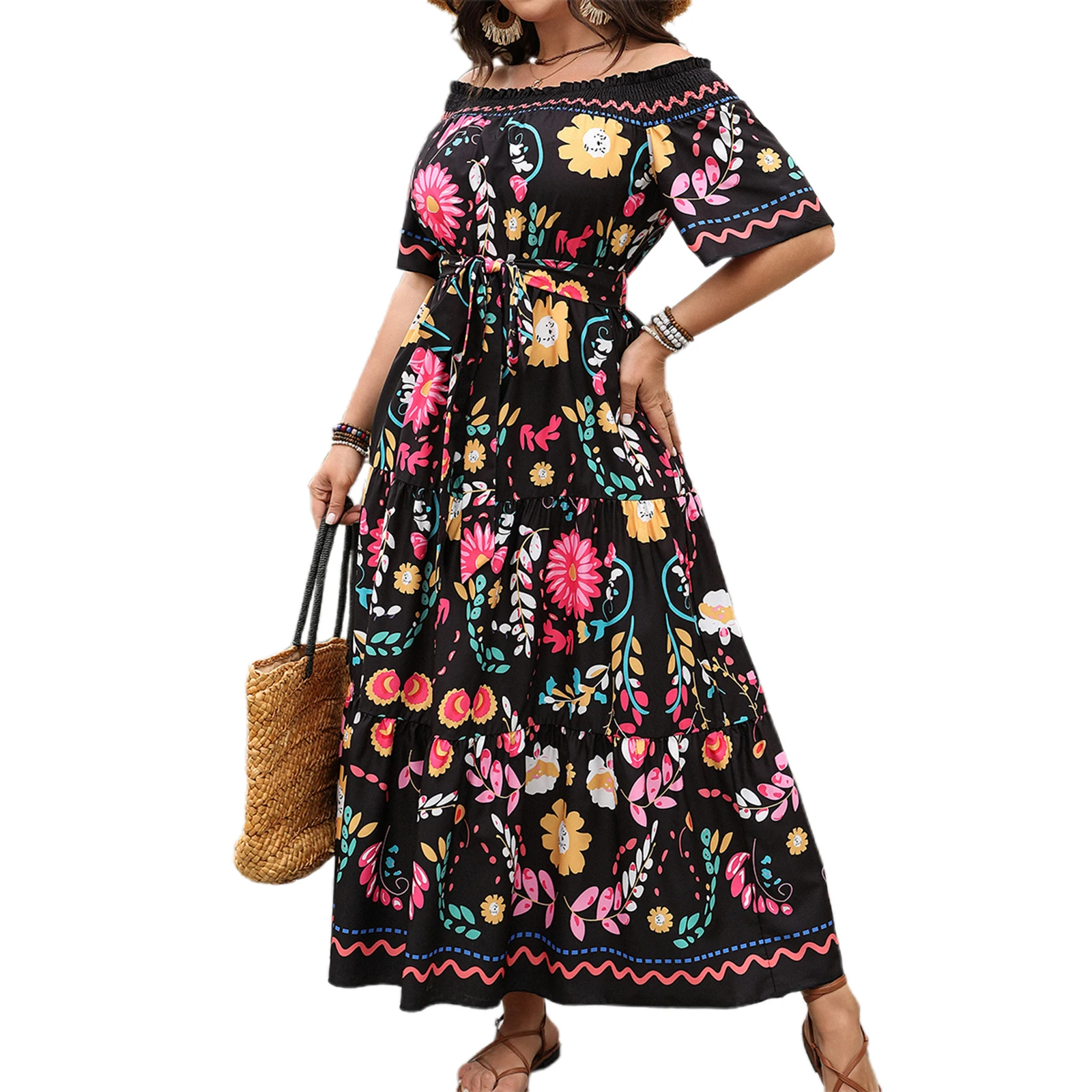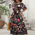 Women Long Dress, Elegant Off-shoulder Dress Flower Print Summer Swing Dress for Vacation