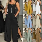Women’s summer sleeveless twisted knot cotton strappy pants button openings loose long pants with pockets