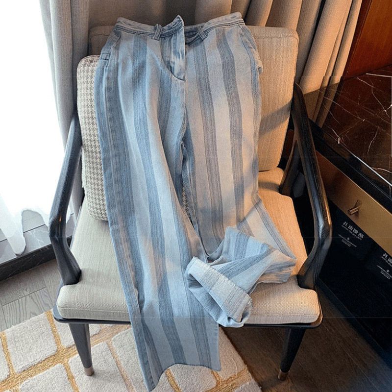 Denim Pants Woman Blue Trousers High Waist Shot Vertical Stripes Jeans for Women Straight Leg A Trend 2025 Medium Top Selling R