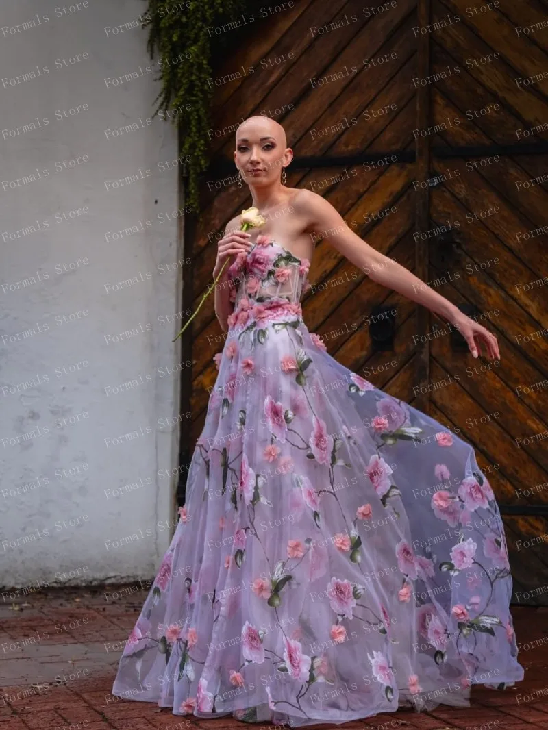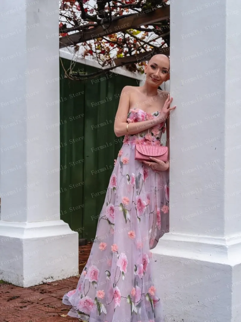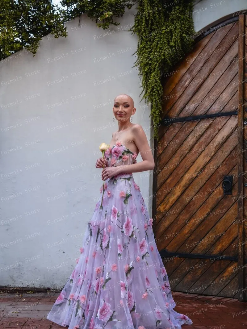 Ethereal Floral Print Gown With Pink Roses On Sheer Fabric Flowing Dress Strapless Design Highlighting Femininity And Grace