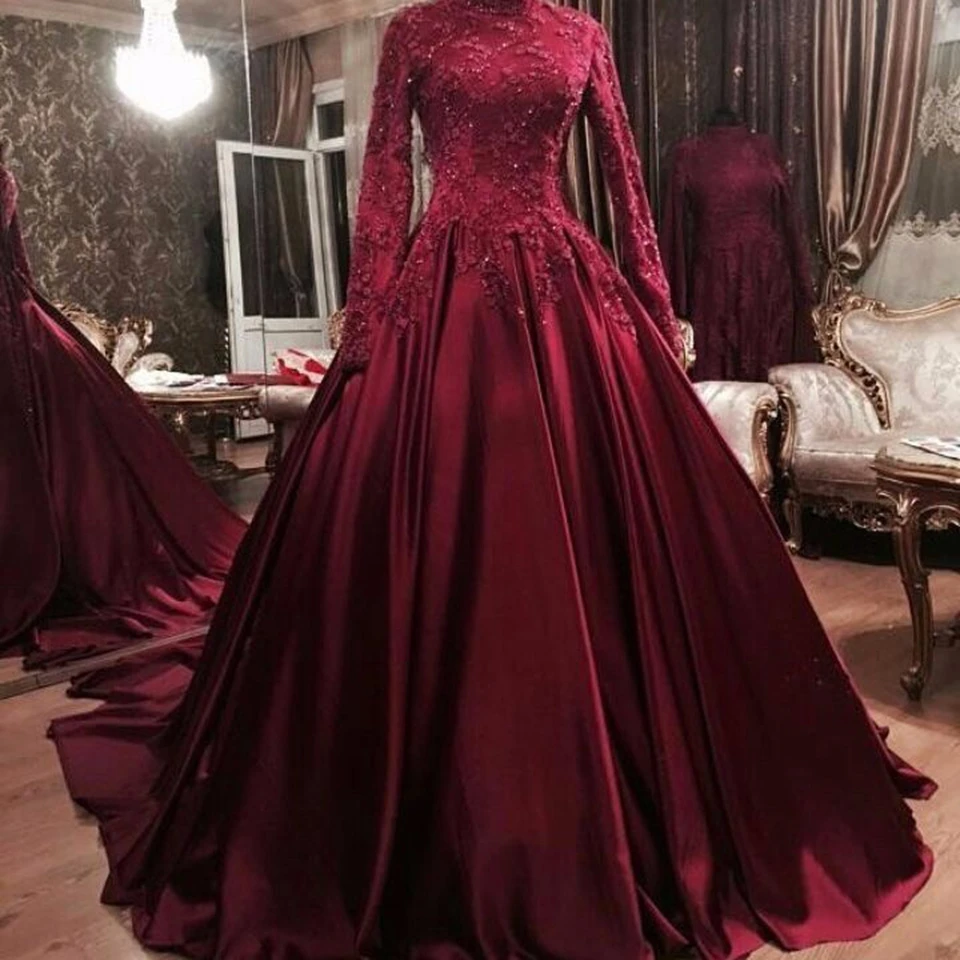 Muslim Evening Dresses Women Formal Party Vestidos De Gala Elegant Luxury Appliques Sequins Lace Wine Red Graduation Prom Gowns