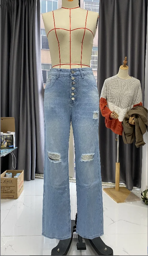 Women's casual trousers 2024 Spring/Summer Latest Button Fly Ripped Button Pocket Low Waist Straight Daily Versatile Denim Jeans
