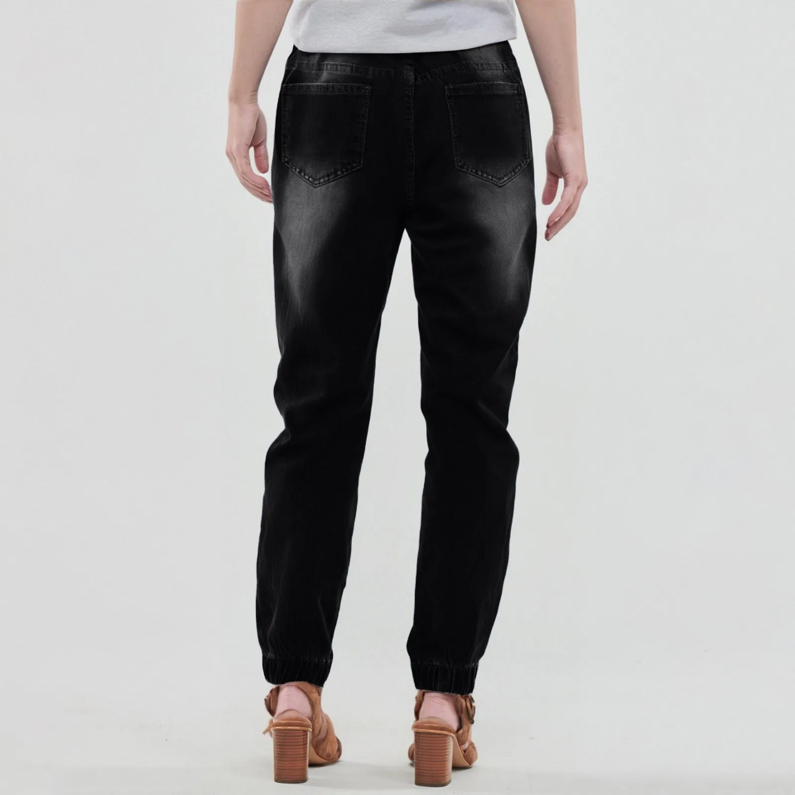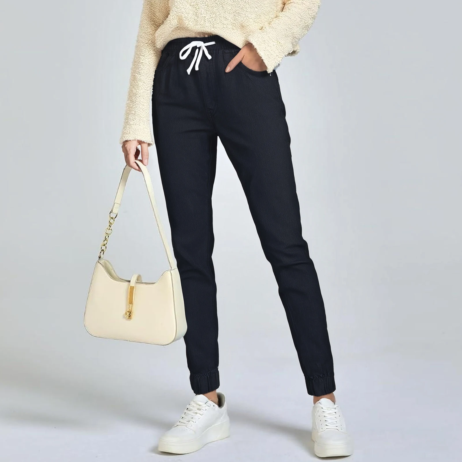 Women's Casual Solid Color Mid Waisted Poket Jeans Pants Denim Casual Trousers