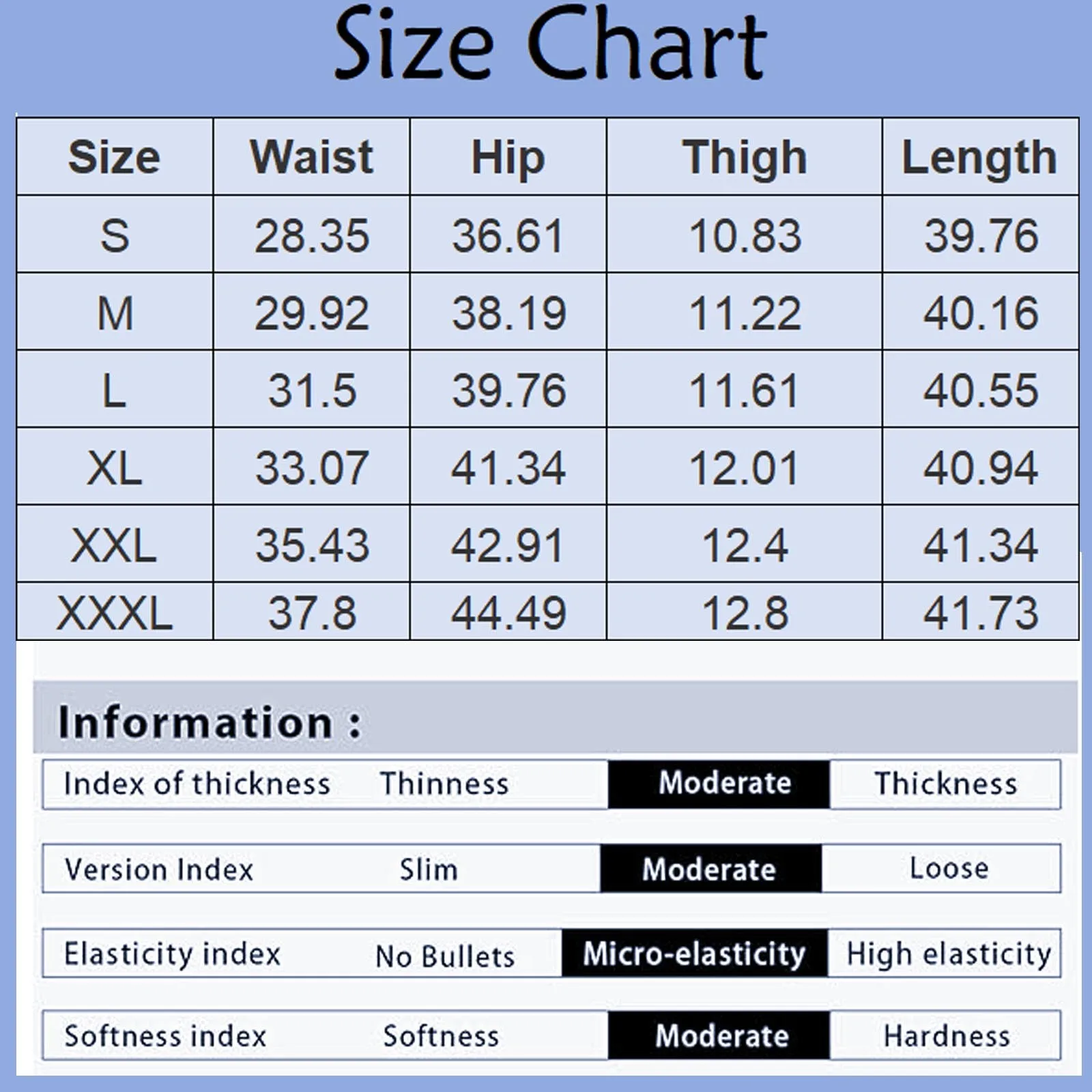 | Size | Waist | Hip | Thigh | Inseam | Length |